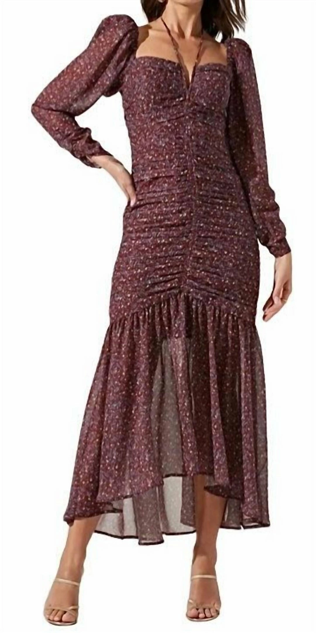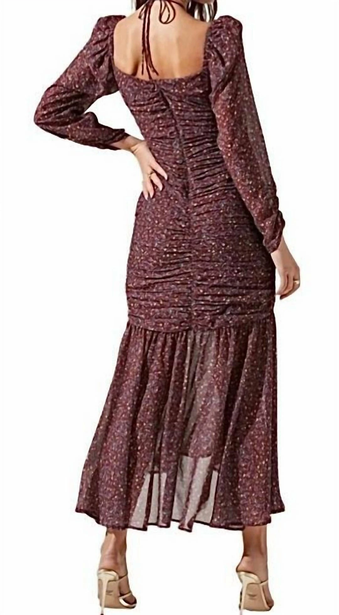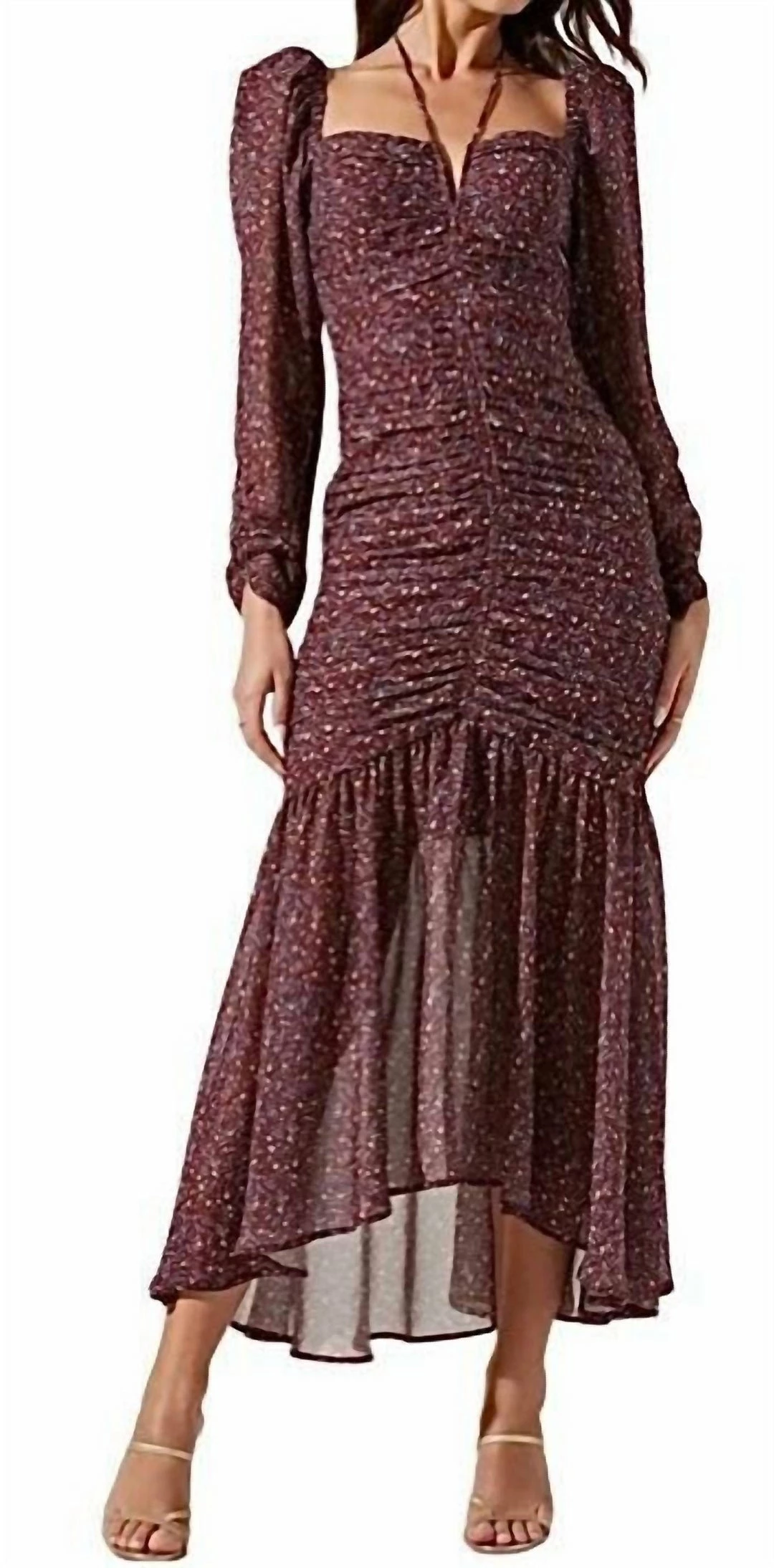 The Athena Dress features a sweet floral print and silhouette that starts with a notched neckline with underwiring and tying halter straps. Ruched bodice leads to a tiered skirt. Long sleeves with voluminous shoulders and ruched cuffs. Concealed back zip closure. Partially lined.