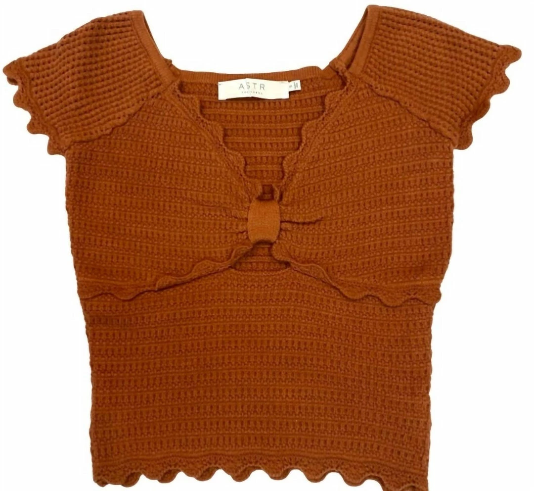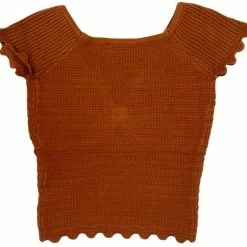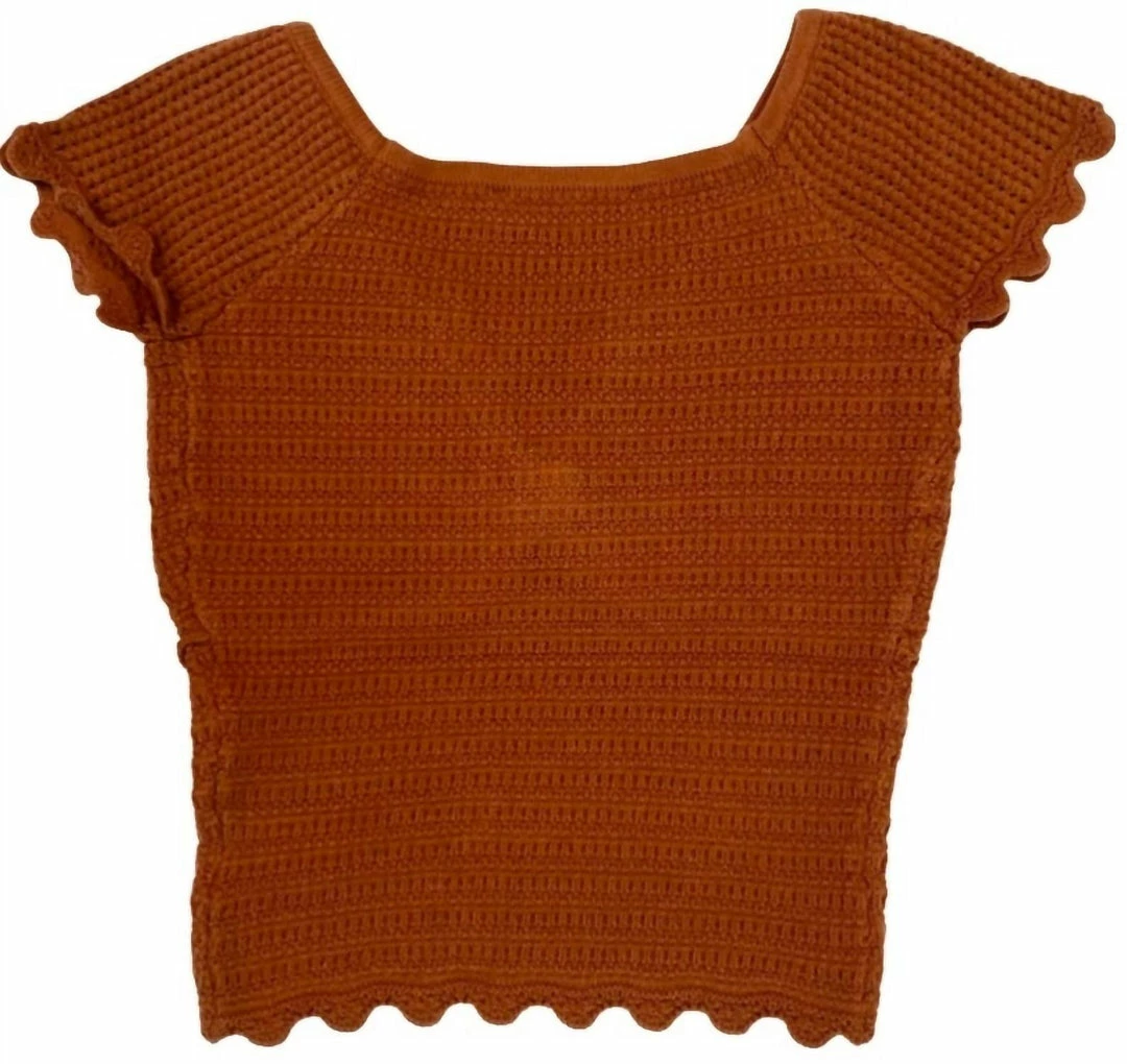 The Becker Top features a crochet knit construction with a Vneck neckline that leads to a scalloped design throughout with a coordinating scalloped hem and cap sleeve.
