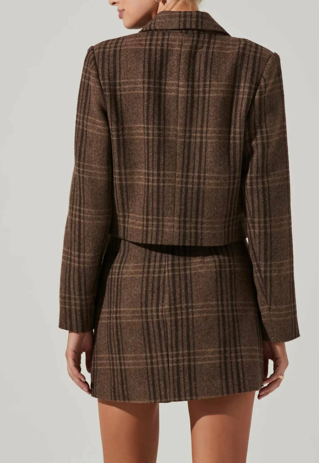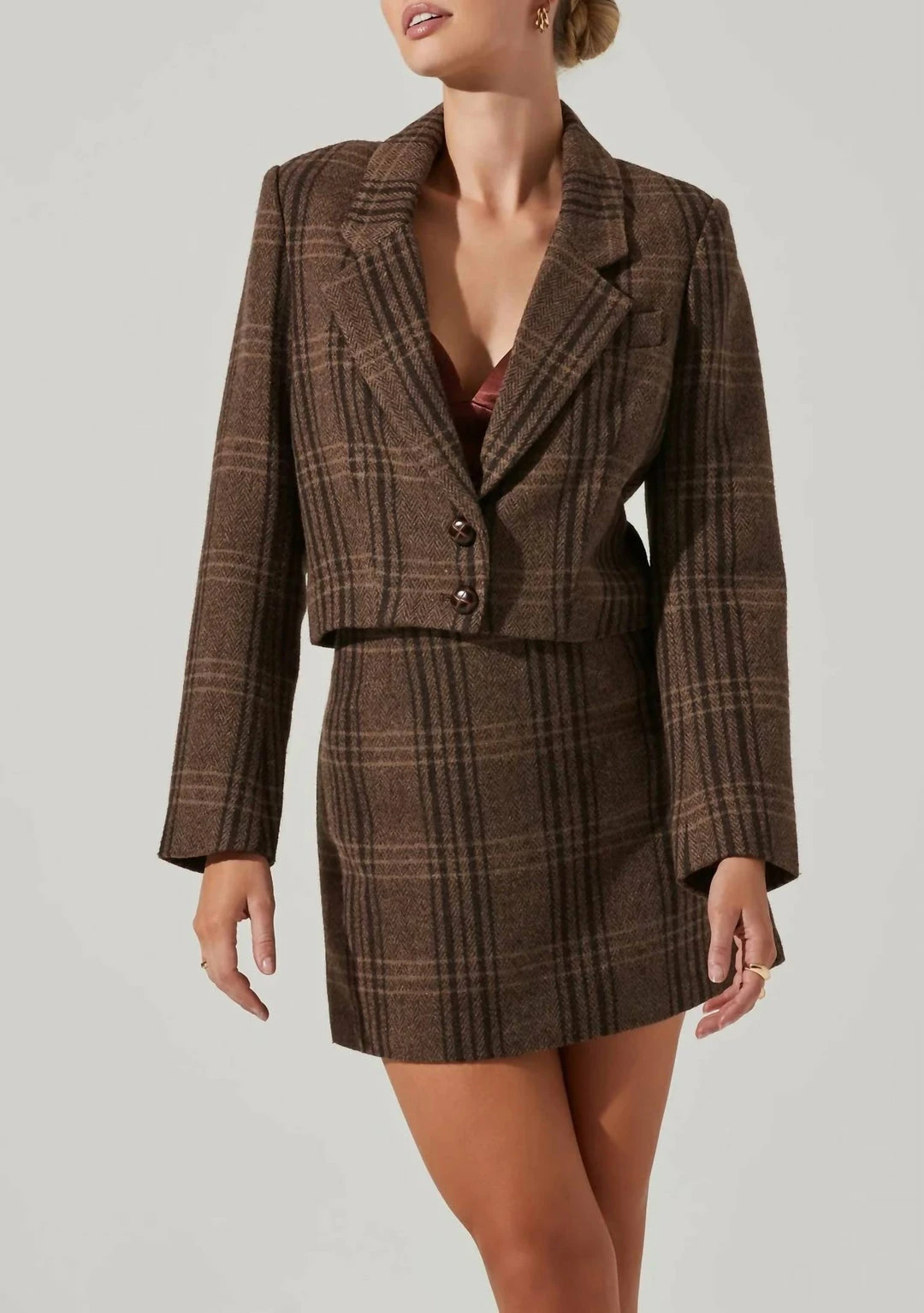 Features an allover plaid print, notched collar and padded shoulders. Buttoned front and cropped silhouette. Long sleeves. Partially lined.