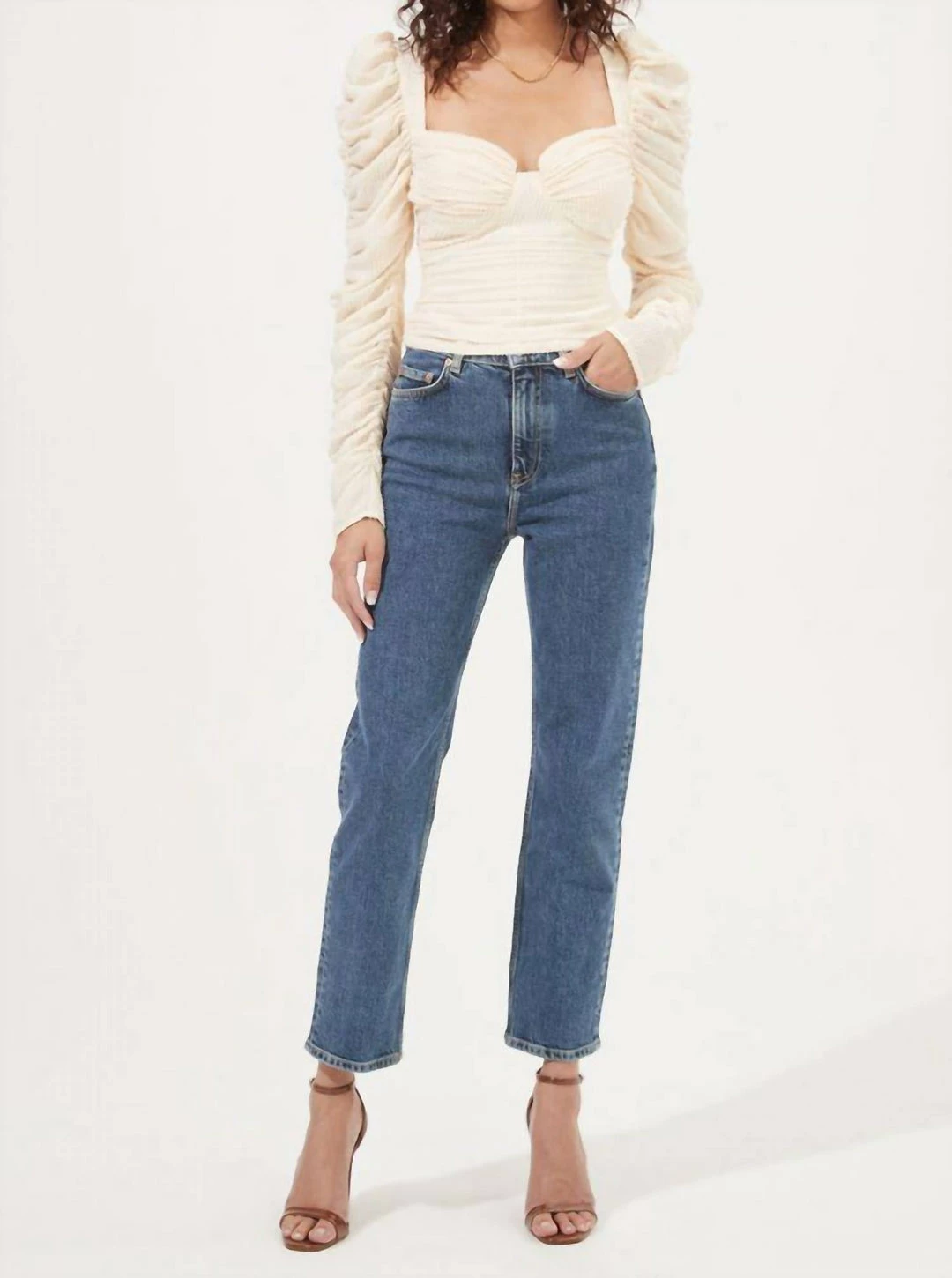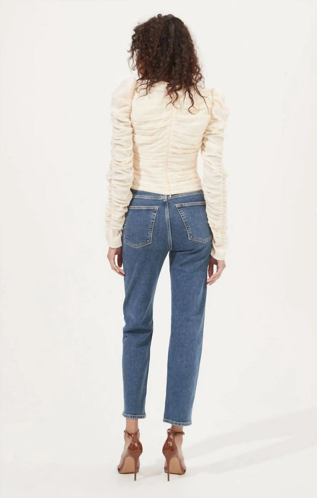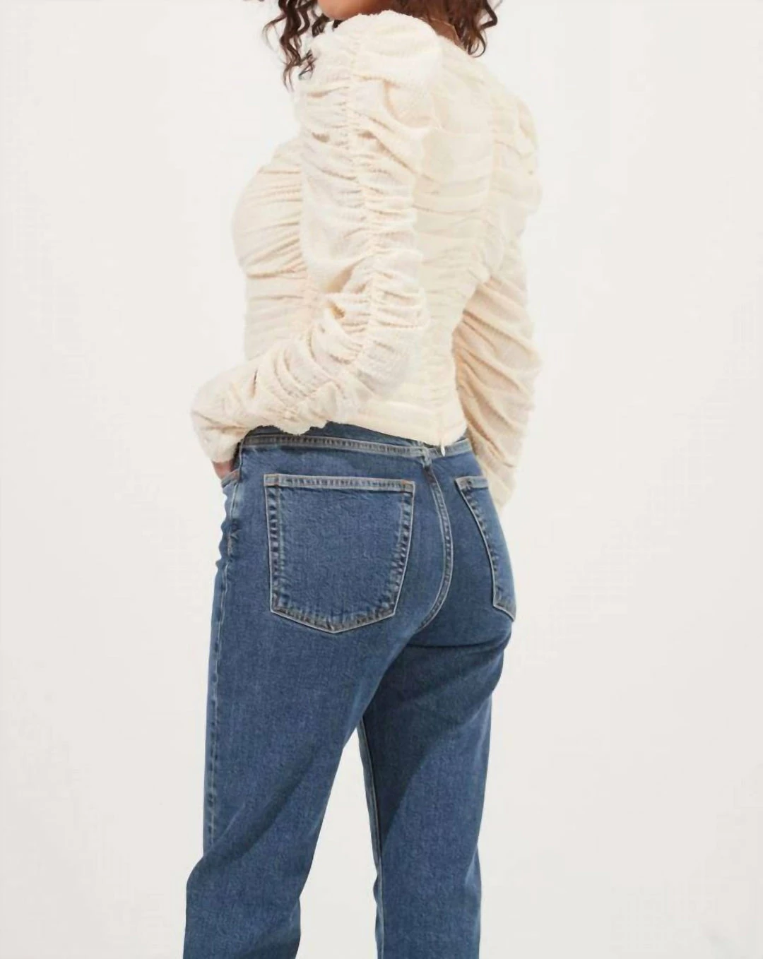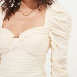 Ivory metallic, textured top with sweetheart neckline, ruched sleeves and bodice. Statement shoulders. Hidden back zipper.Â
