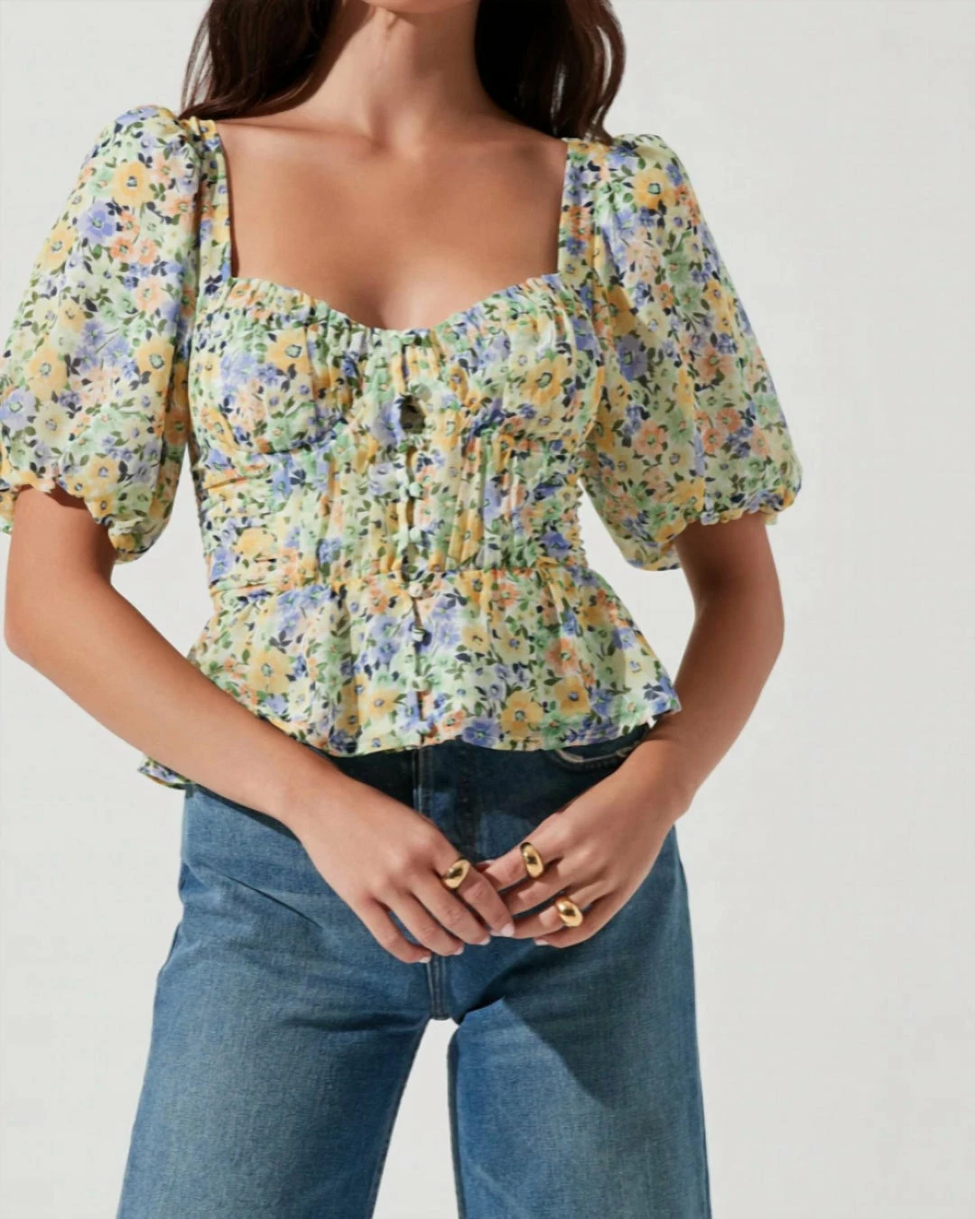 The Clairemont Top features a soft floral print that starts with a sweetheart neckline and leads to a cupped bust and darted bodice. Peplum hem. Puff sleeves. Tie back accent. Smocked back.
