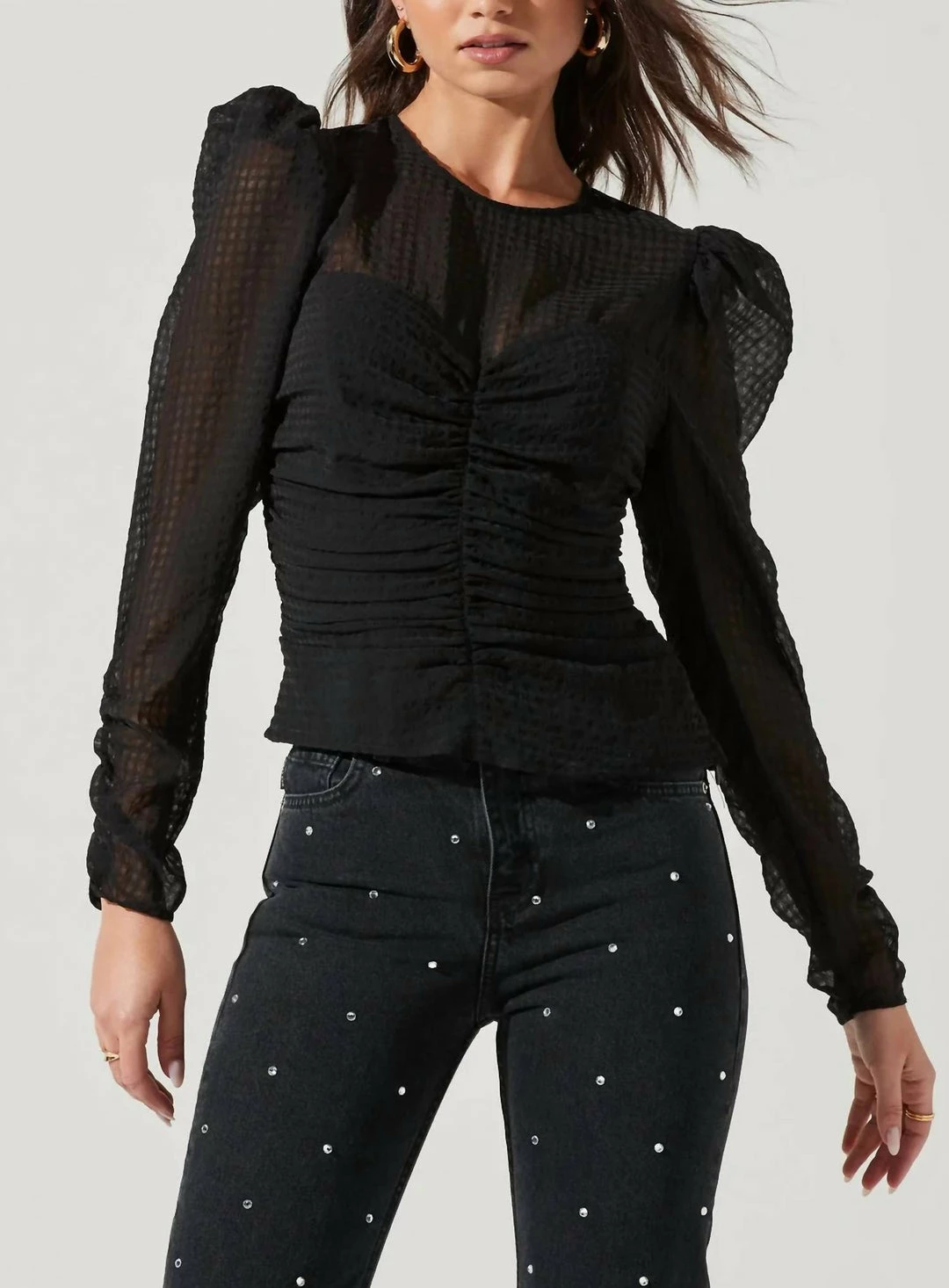 Featuring a textured overlay, a sweetheart neckline leads to a ruched bodice. Long sheer sleeves with exaggerated shoulders and ruched cuffs. Keyhole back.