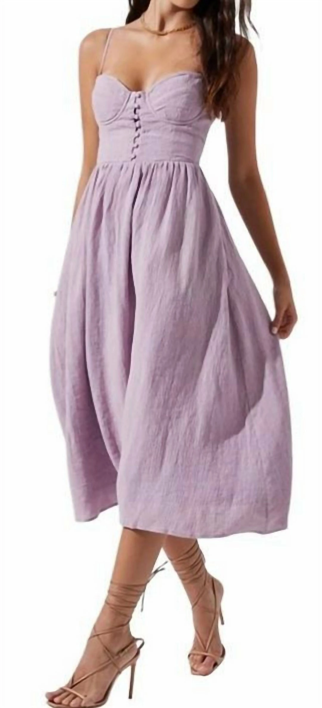 The Ferreira Dress features a sweetheart neckline and cupped bust. Button-down bodice leads to a midi skirt with side pockets. Smocked back. Adjustable straps.