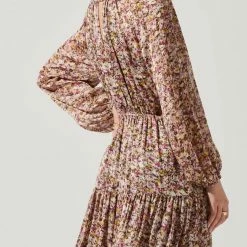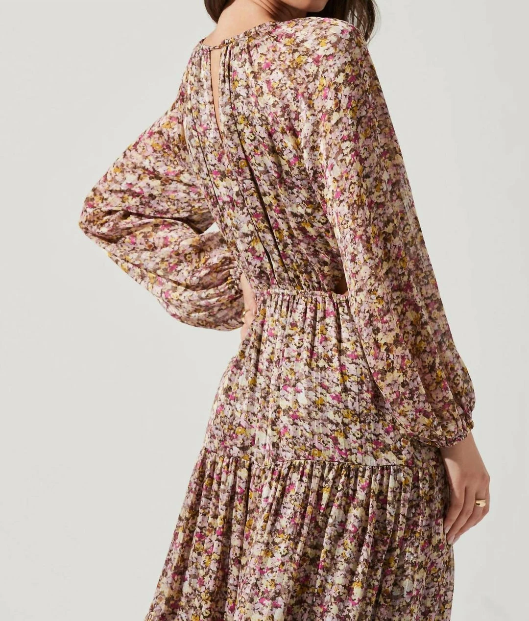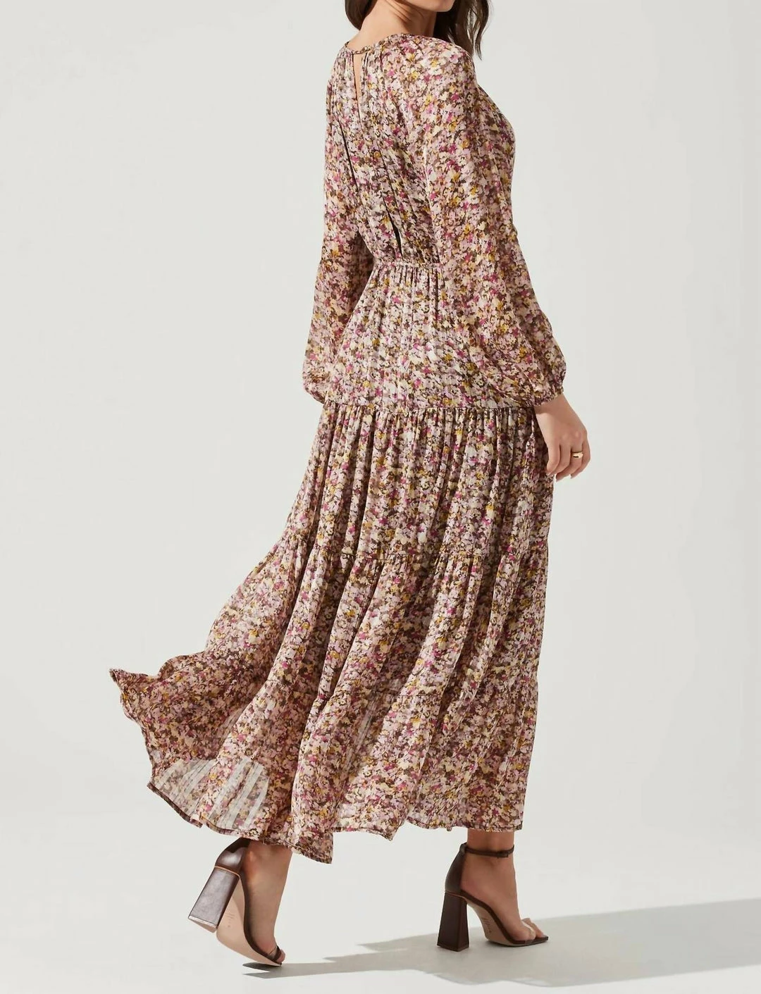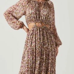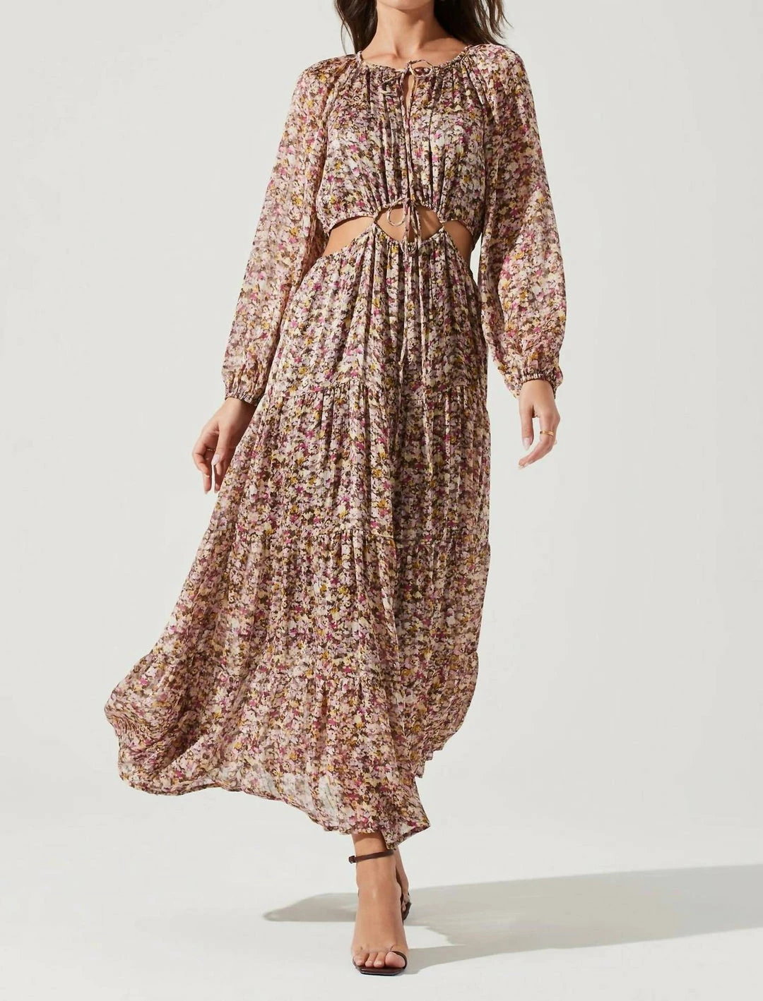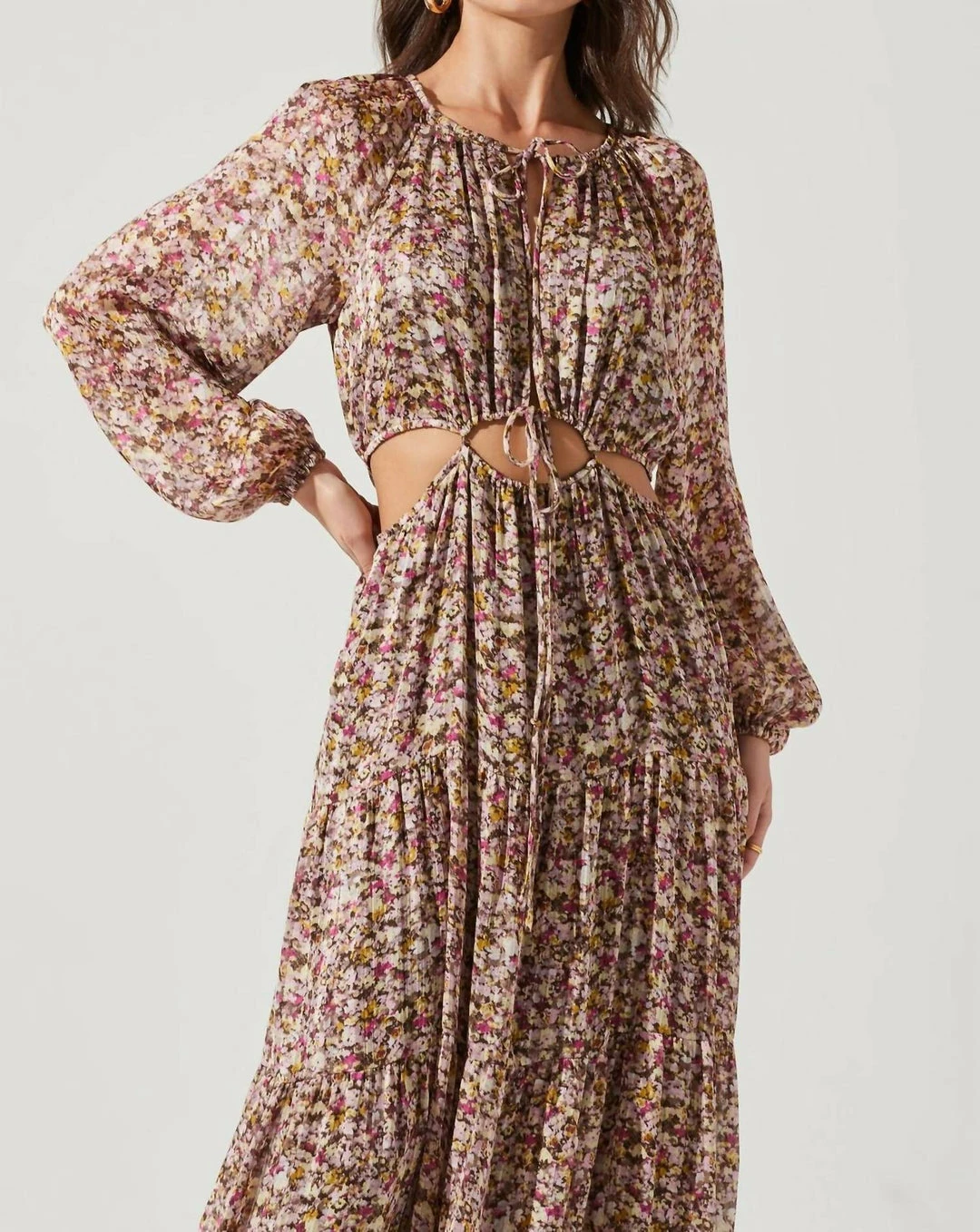 Features a moody floral print. Round neckline leads to a tie front and keyhole detail. Cutout midriff features a tie waist accent.Tiered maxi skirtLong sleevesKeyhole frontFully linedDry Clean OnlyPull on