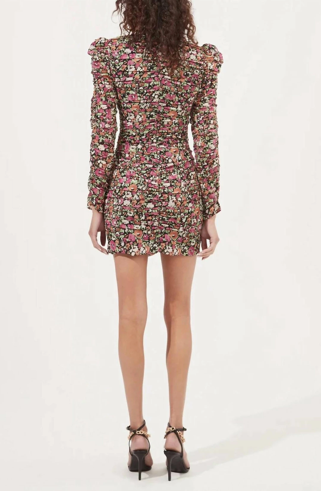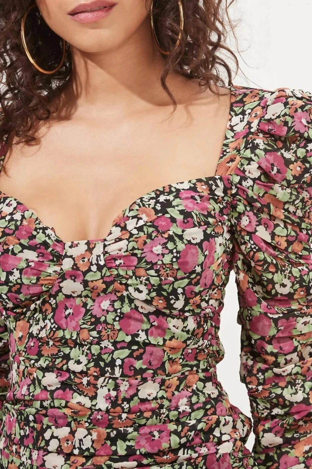 The Jadine Dress blooms with a wintry floral print throughout. Sweetheart neckline descends to a fitted, ruched bodice and abbreviated hemline. Puff shoulders and long ruched sleeves. Concealed back zip closure.