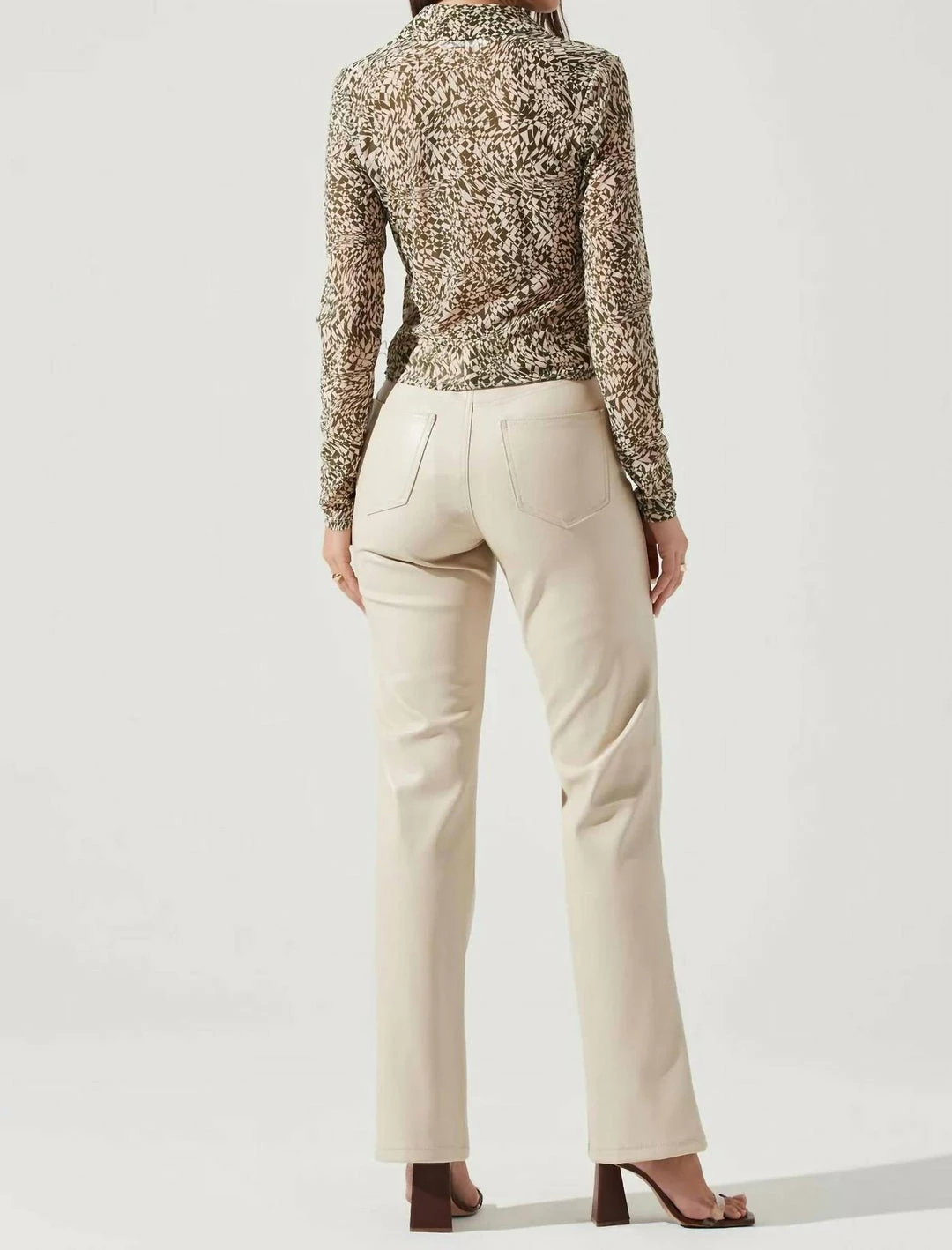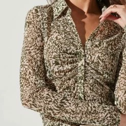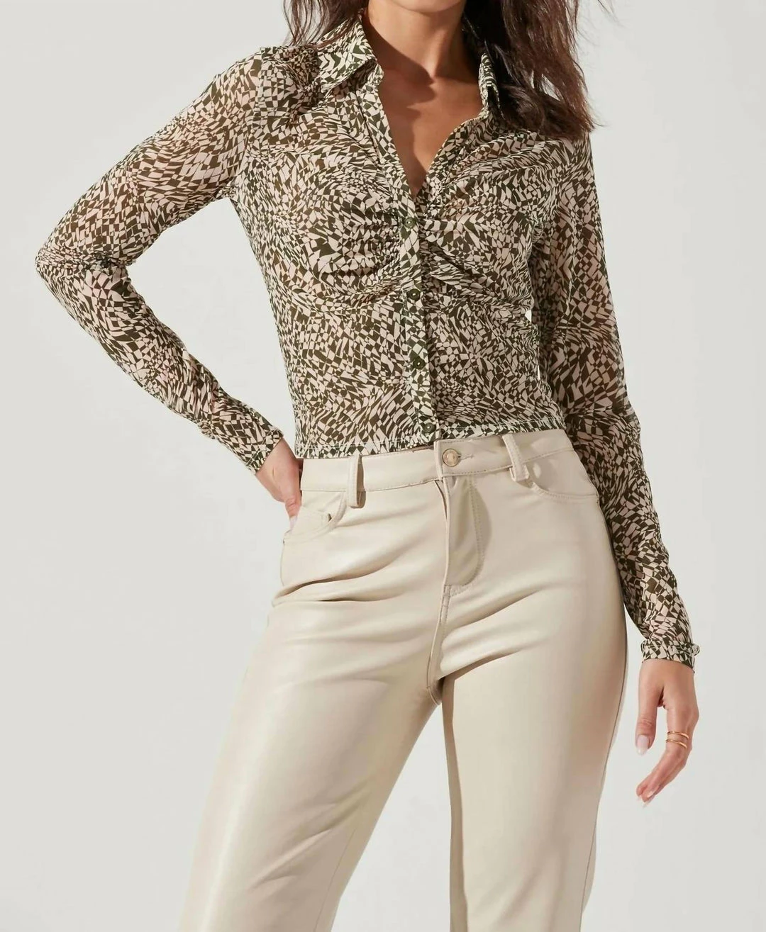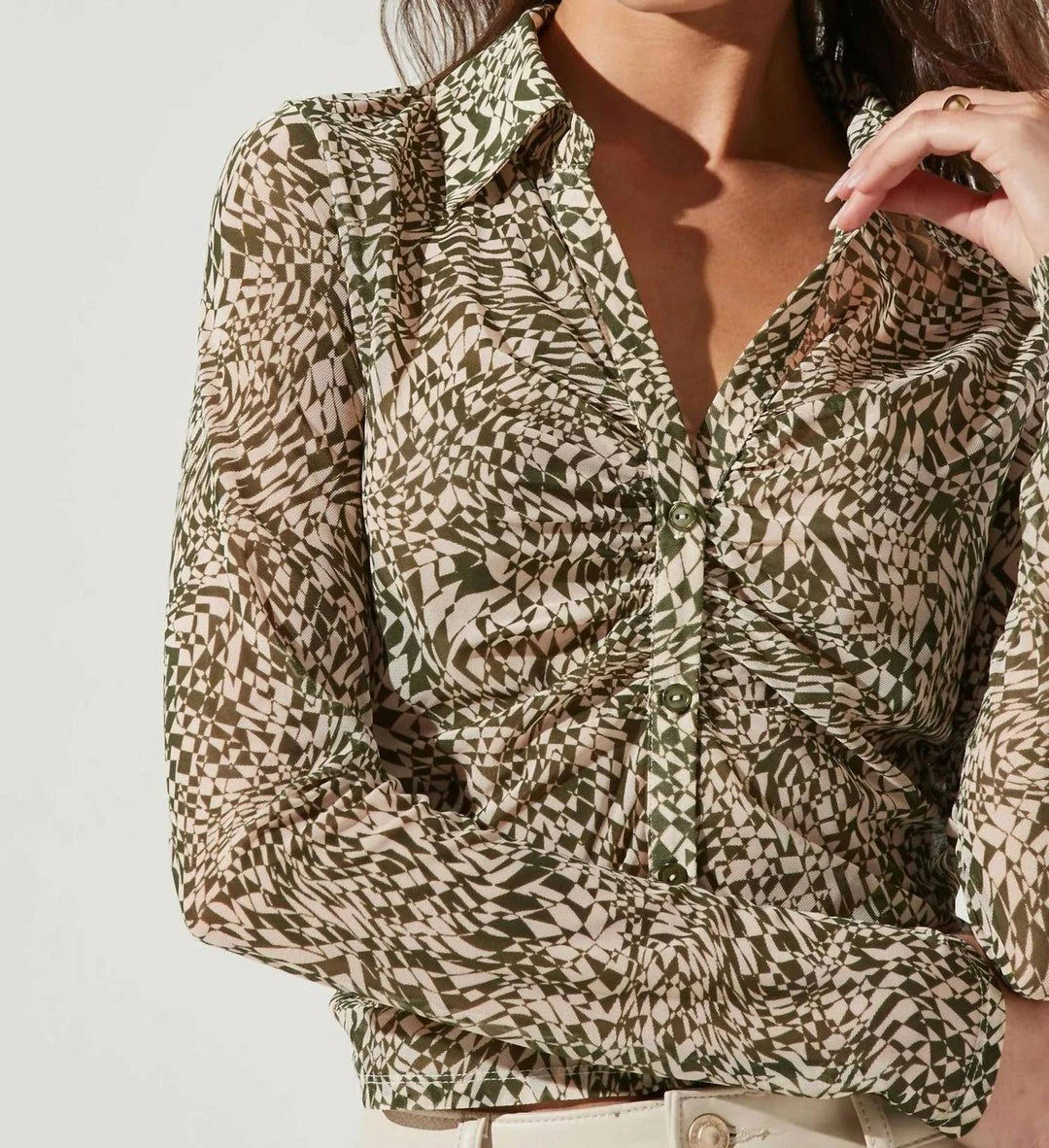 This statement top features a sheer mesh construction. Pointed collar leads to a front button placket with ruching at the bodice. Long sleeves. Slight stretch.