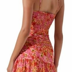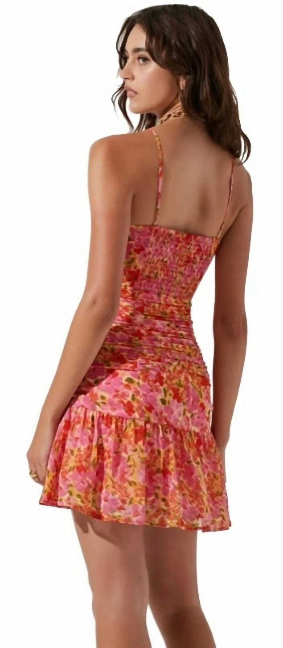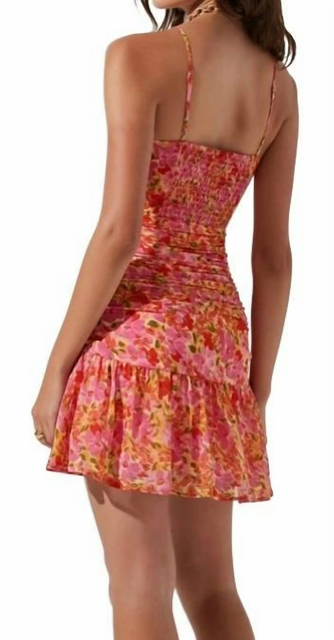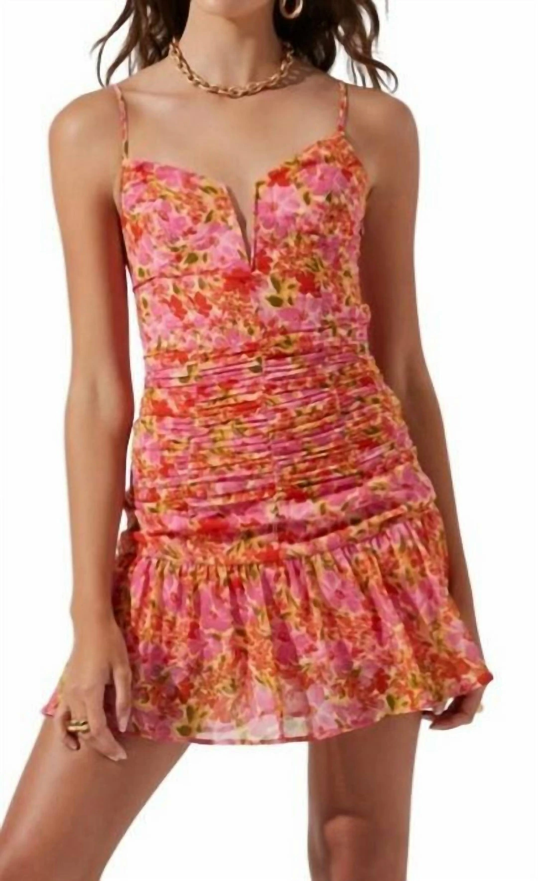 The Meg Dress features a ditzy floral print throughout. Sweetheart neckline leads to an underwired notch detail. Ruched bodice leads to a ruffle trim mini skirt. Fully lined. Concealed zip closure. Adjustable straps.