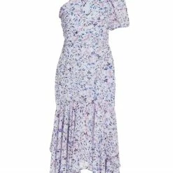 The Santorini Dress features a blooming print throughout. One-shoulder design features a statement puff sleeve. Fitted bodice descends to an asymmetrical hemline for added interest. Fully lined.