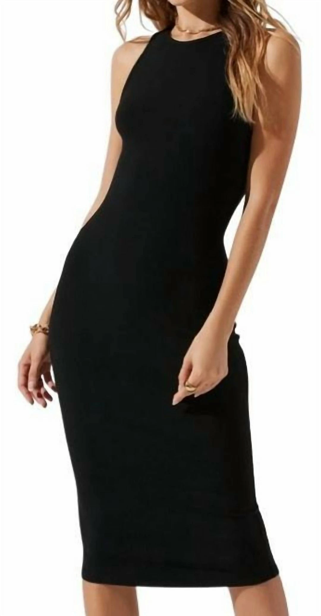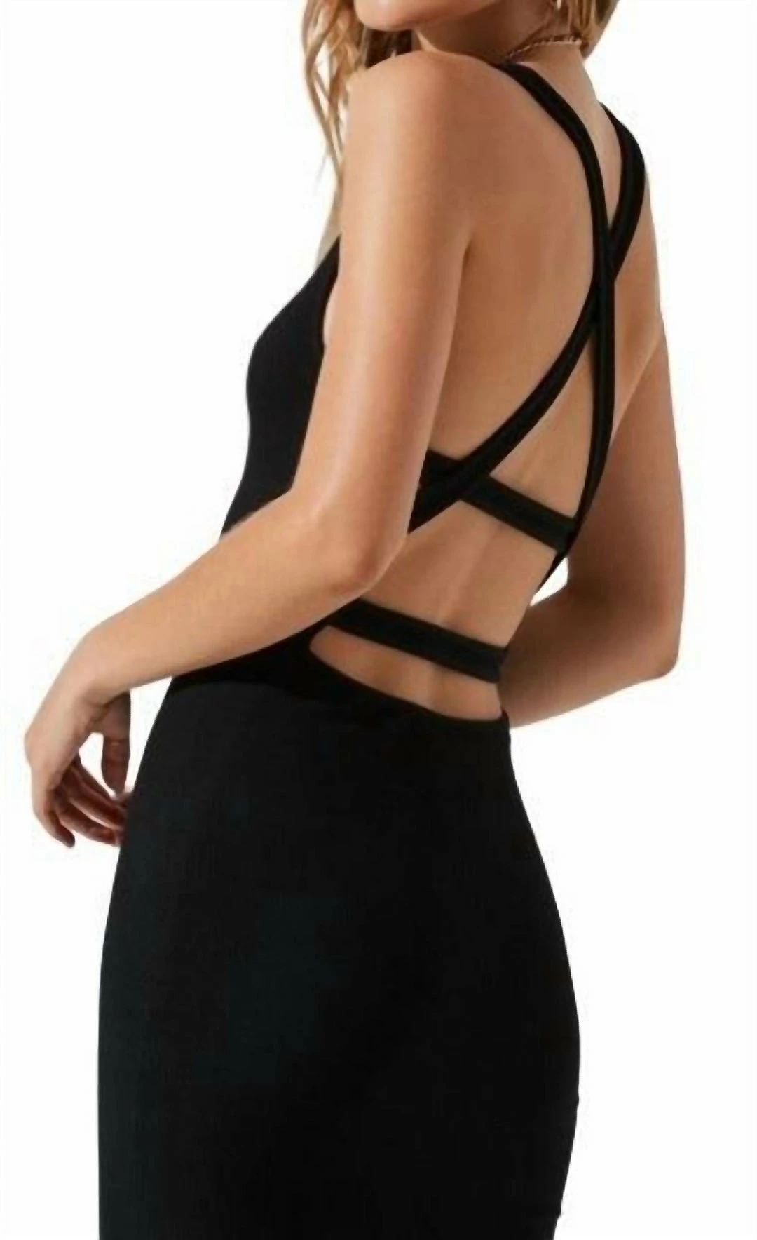 It features a ribbed knit construction with a crew neckline and sleeveless design. Cross strap back. Bodycon silhouette.