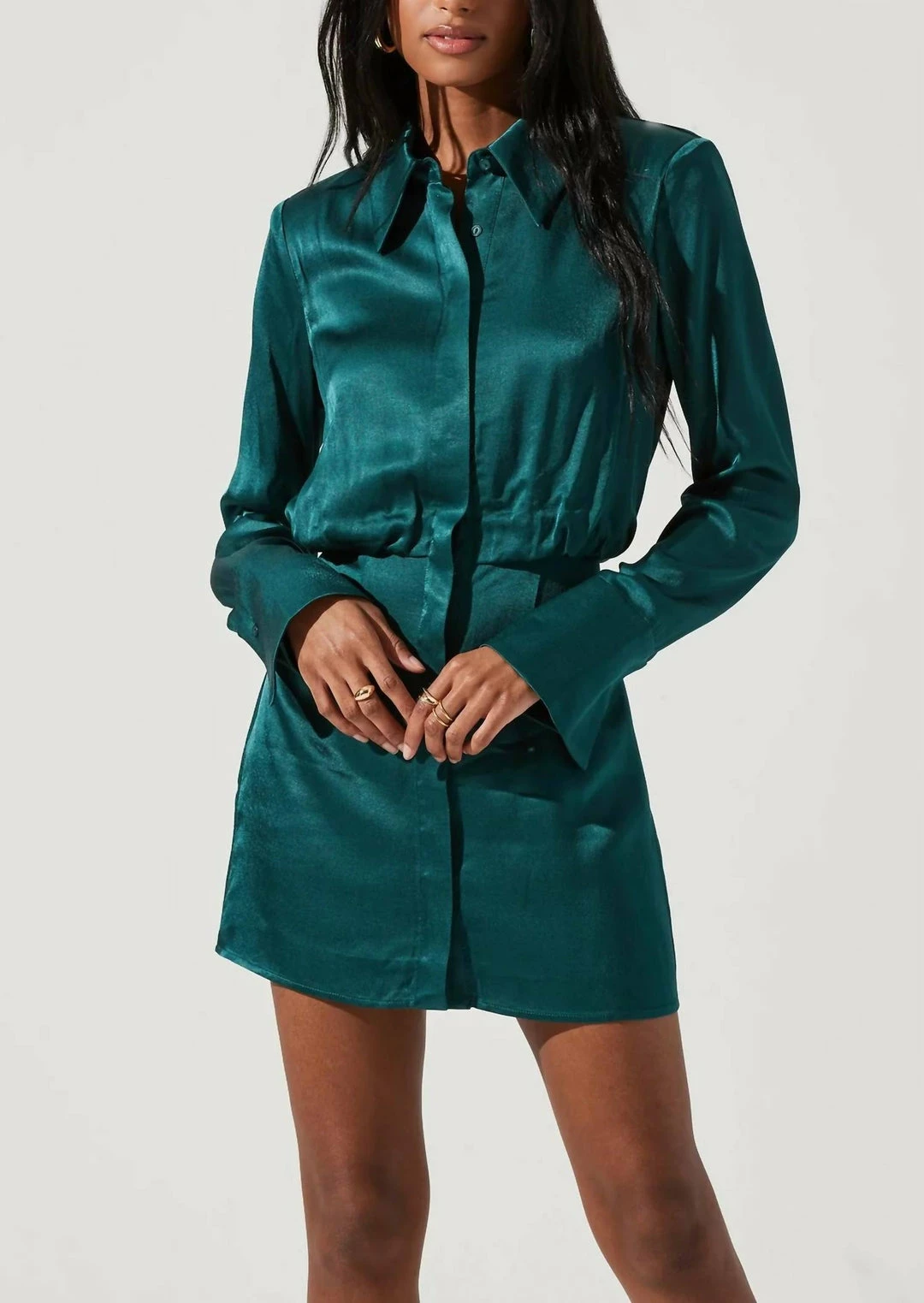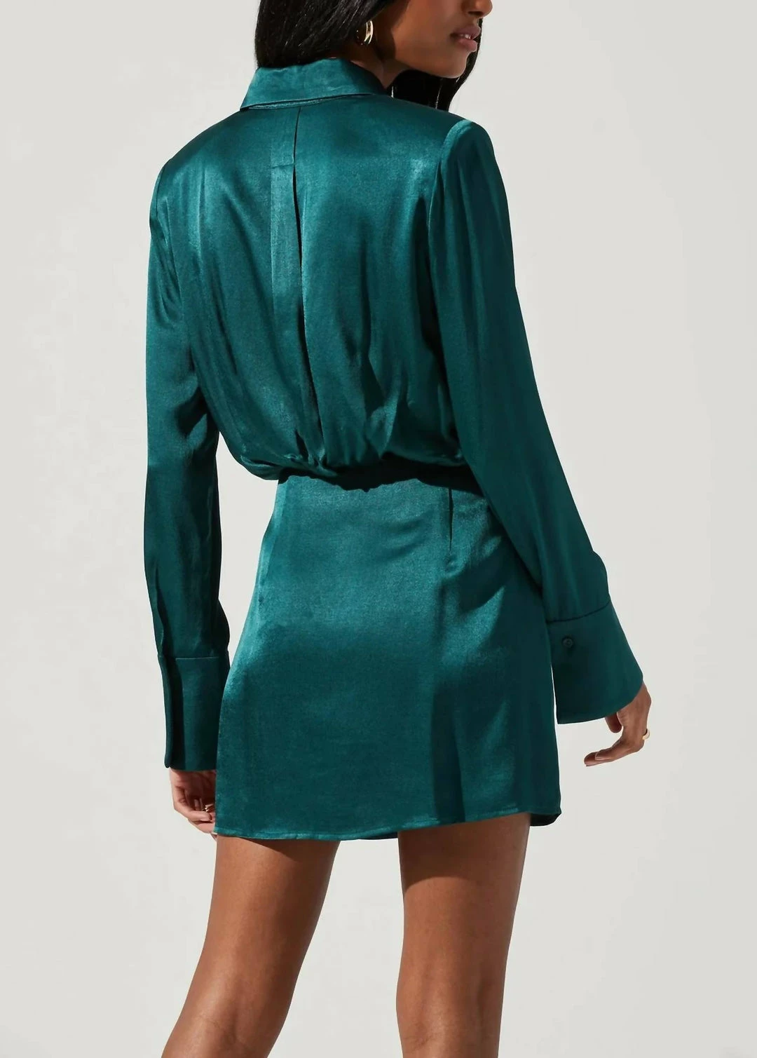 Features a stunning satin finish. Pointed collar leads to a front button placket and a cinched waist. Long sleeves with buttoned cuffs.