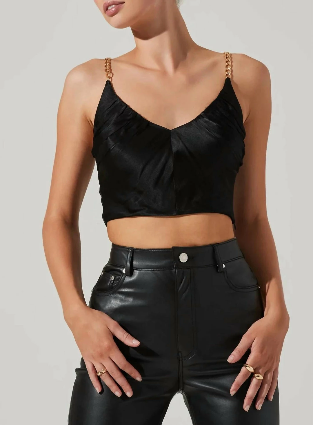 Features a high-shine satin finish. Scoop neckline leads to a fitted silhouette and cropped hem. Statement chain link straps are adjustable. smocked back. Concealed side zip closure.