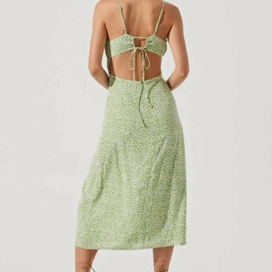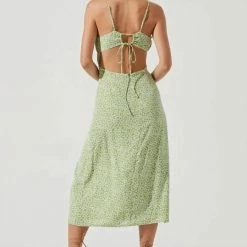 This summer-ready dress features a ditsy floral print throughout and a square neckline with ruffle trim and keyhole accent. Ruched bodice leads to a defined waist and midi skirt with a side slit accent. Cutout back with tying straps. Adjustable straps. Length – 48 7/8″ (Size M) Model is Wearing Size S Fits True to Size Model’s Measurements – Height 5’8″ // Bust 32″ // Waist 24″ // Hips 34.5″ Lining 97% Polyester 3% Elastane Invisible zipper Dry clean only