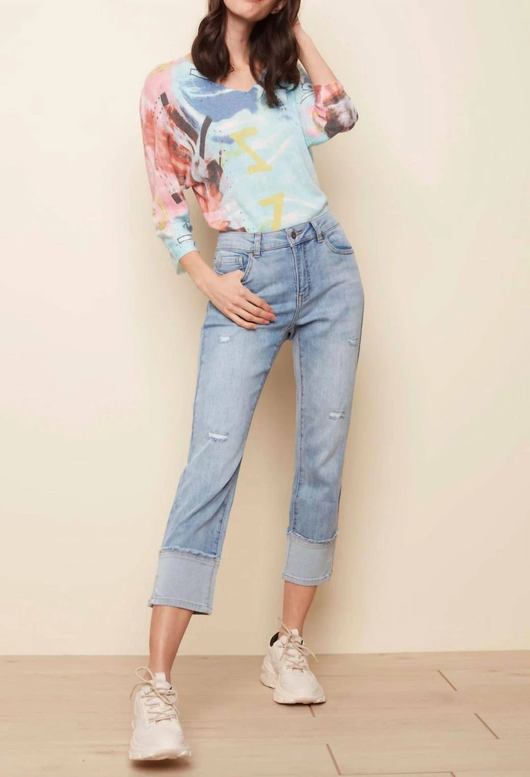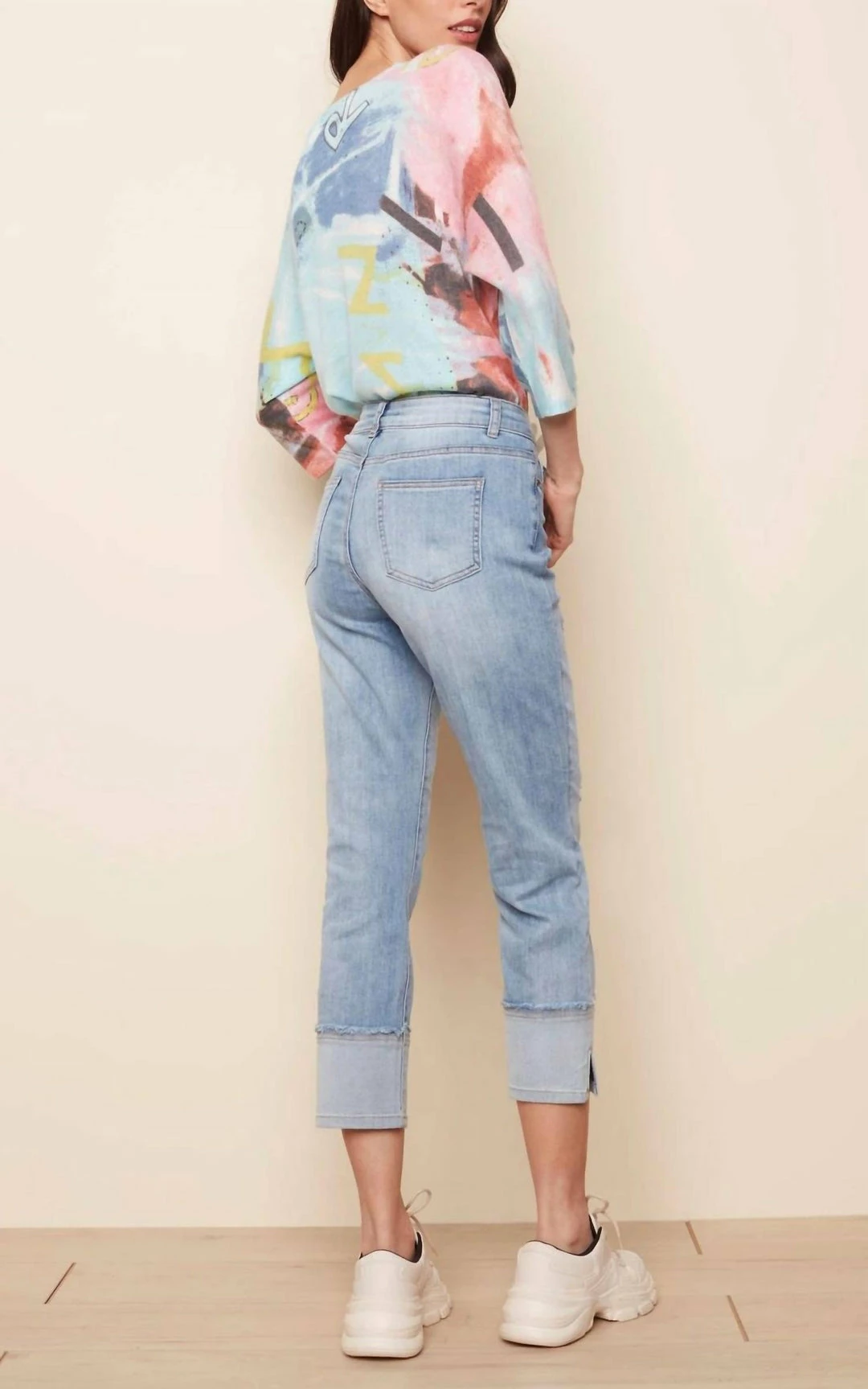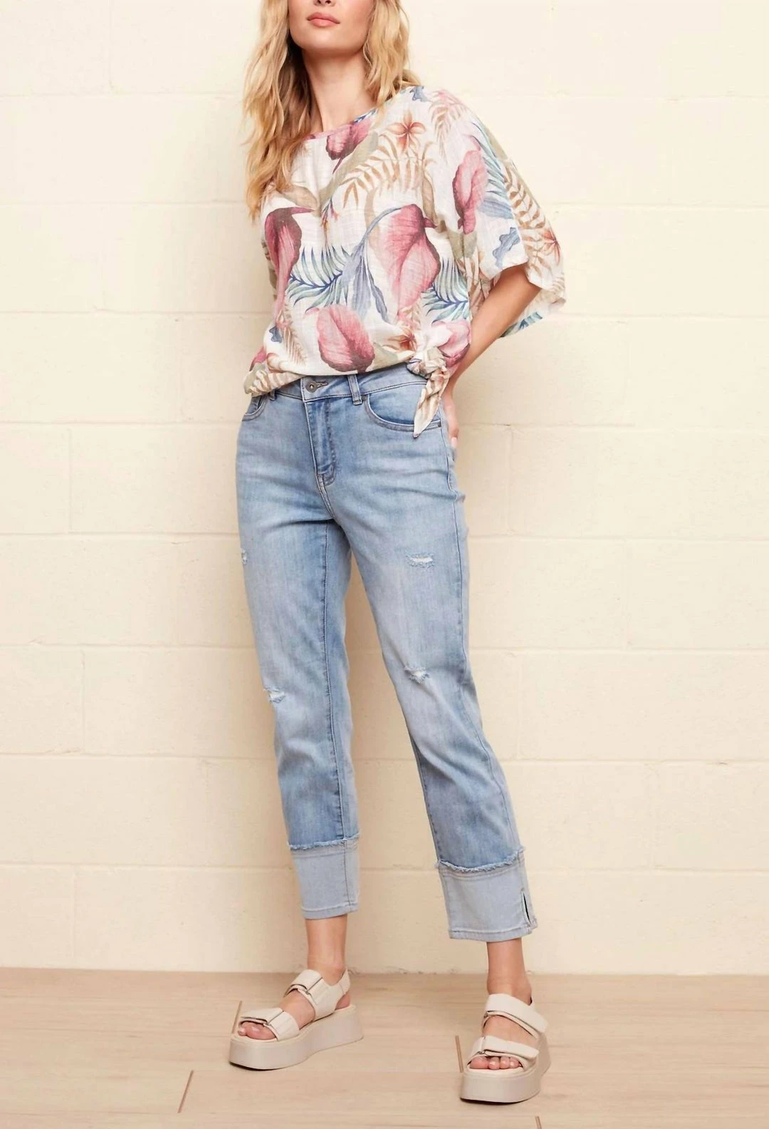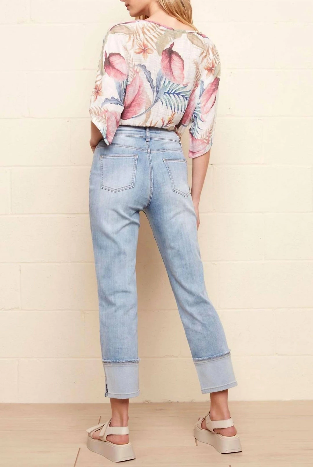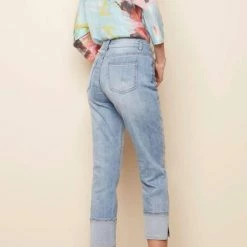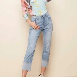 Be Chuffed To Bits About These Amazing Stretch Denim Pants For Women Featuring Eye-Catching Wide Cuffs And Side Slit Details. A Must-Have Basic, These Cropped Jeans With A Bit Of Stretch Combine Both Comfort And Style. Choose The Light Blue Jeans For Everyday Spring And Summer Fun.