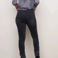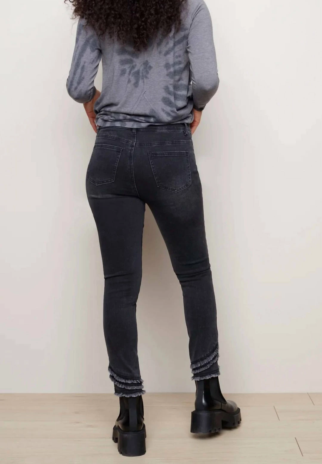 5 pockets. Mid-rise. Frayed hem detail. Slim-fit ankle pant