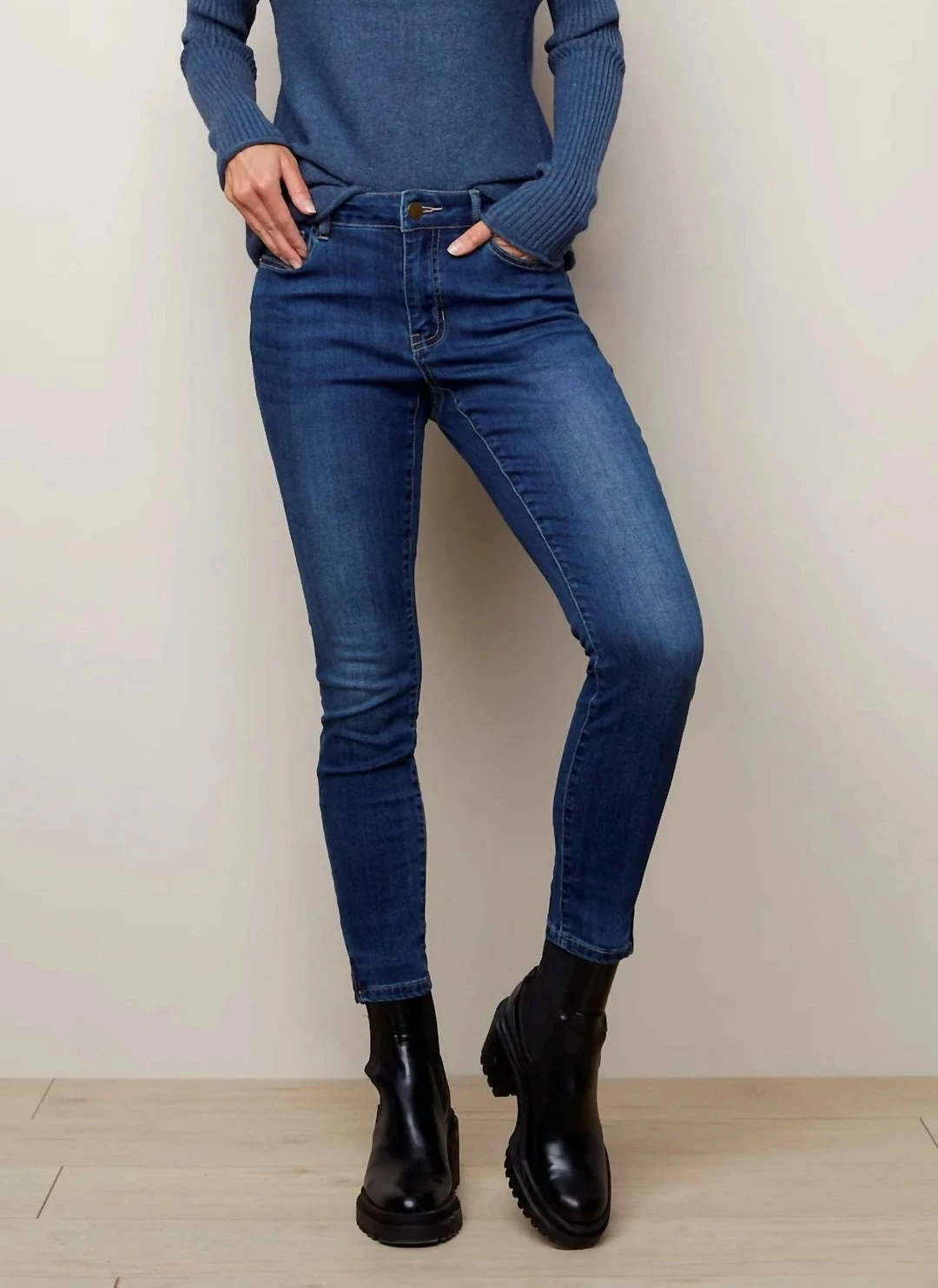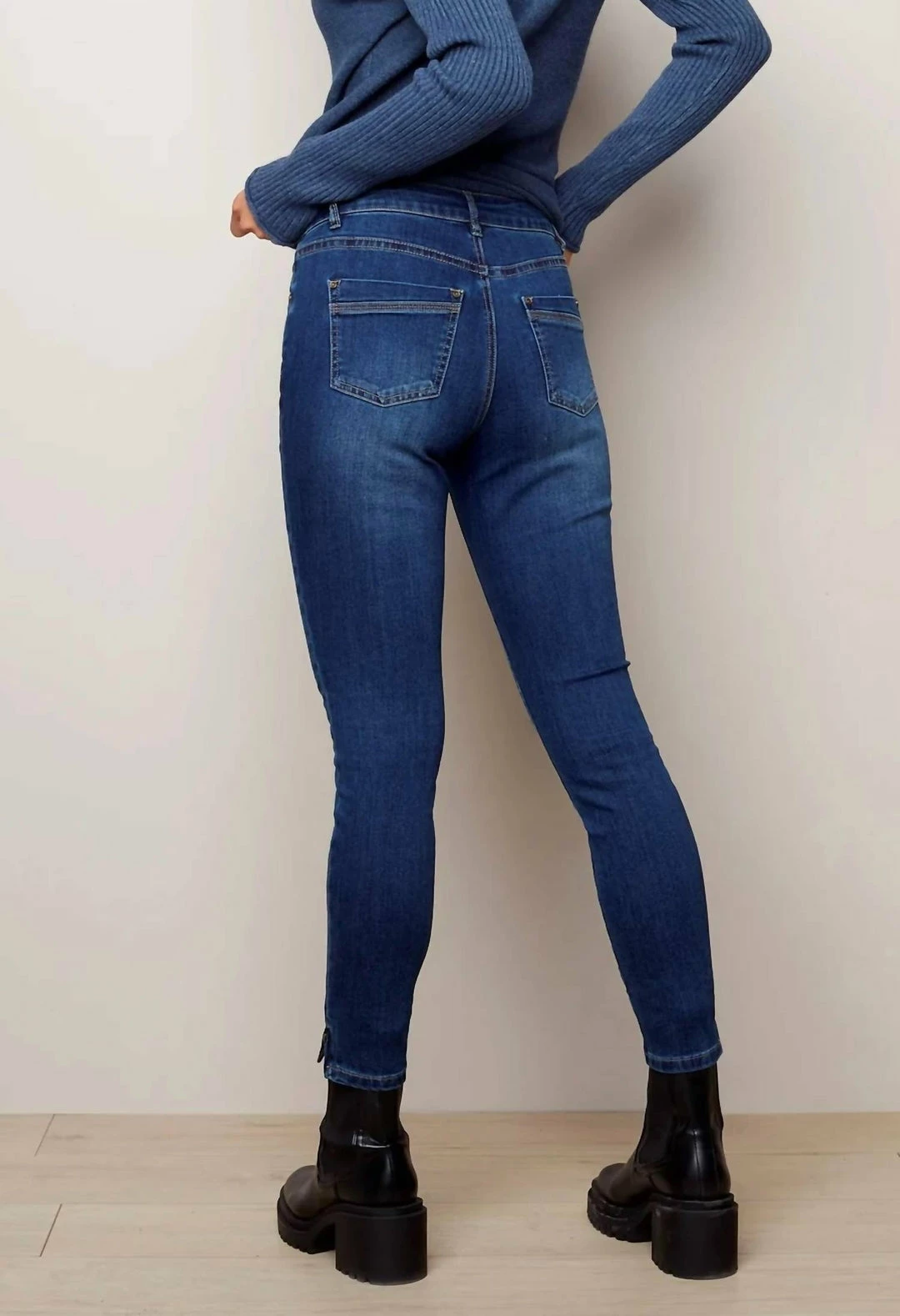 5 pockets. Side hem zipper detail. Mid-rise. Slim-fit