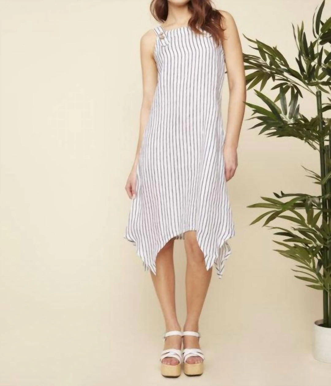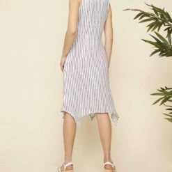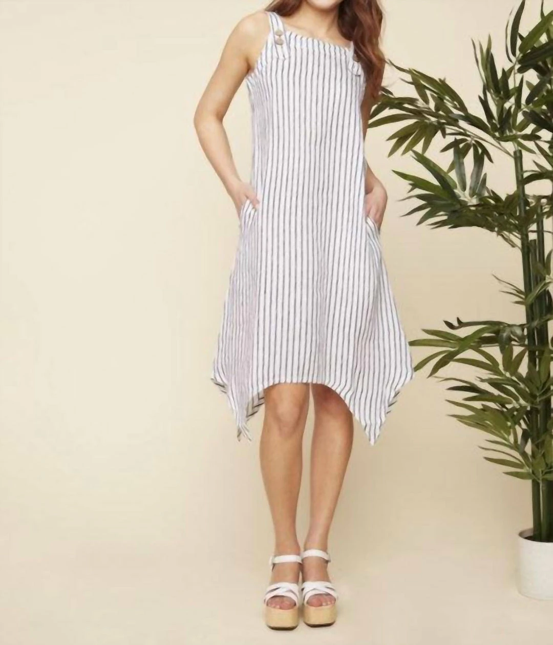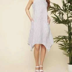 You’ll love the adjustable straps, the movement in the sharkbite hemline and the vertical stripes. The cotton/linen mix will keep you cool and comfortable all day long.Adjustable strapsSharkbite hemSide pocketsContent – 65% Cotton / 35% LinenBack Length – 43 1/2″Care Instructions – Hand Wash Cold – No Bleach – Hang to Dry – Iron at Low Settings – Dry Clean If NeededSizeBust Waist Hips XS 34″ 26″ 36″ S 36″ 28″ 38″ M 38″ 30″ 40″ L 41″ 33″ 43″ XL 44″ 36″ 46″