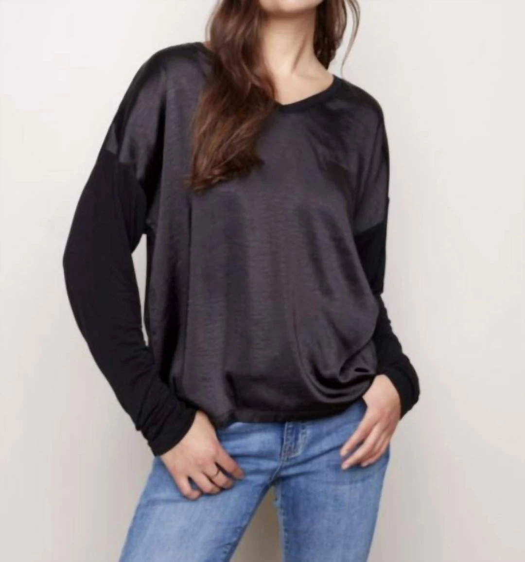Satin/Jersey V-Neck Knit TopDress up or down!!Back Length – 26 1/2″