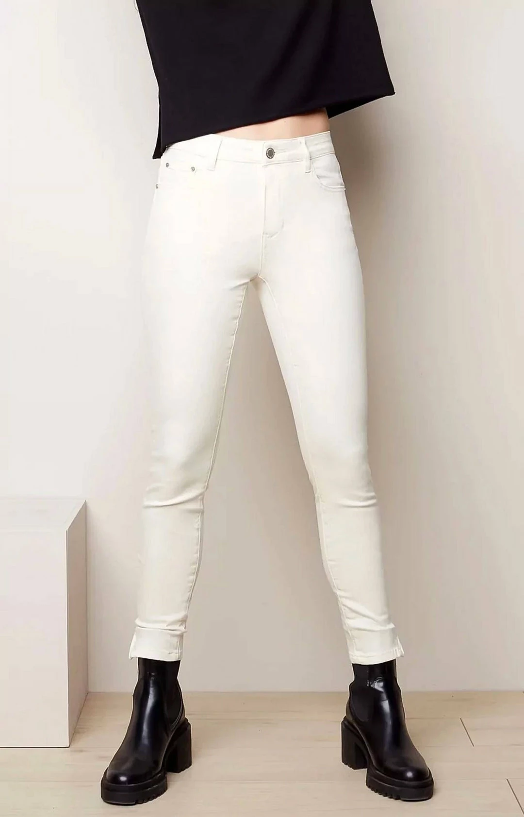 5 pockets. Side hem zipper detail. Mid-rise. Slim-fit