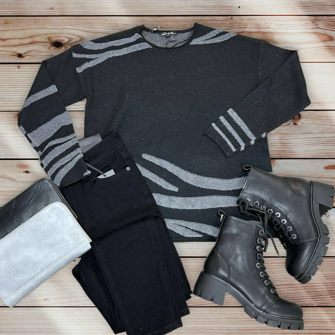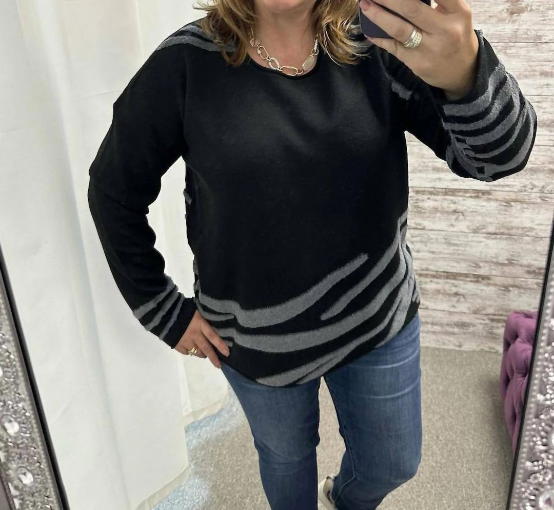 Find comfort and style in this soft sweater with a classic Crew neckline and Zebra stripes in contrasting design. Turn toward this fabulous sweater all winter long!